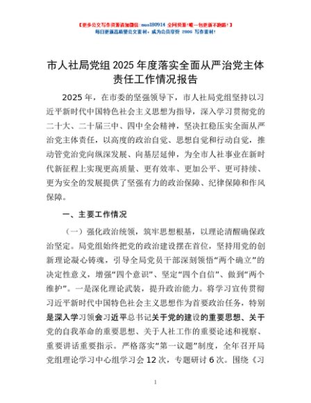 / 市人社局党组2025年度落实全面从严治党主体责任工作情况报告