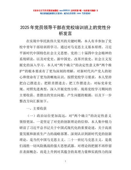 / 2025年党员领导干部在党校培训班上的党性分析发言
