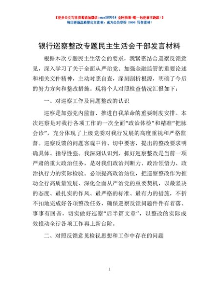 / 银行巡察整改专题民主生活会干部发言材料