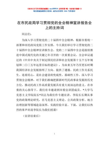 / 在市民政局学习贯彻党的全会精神宣讲报告会上的主持词
