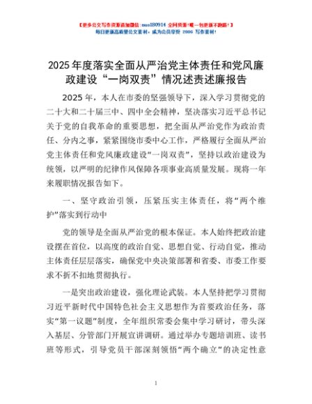 / 2025年度落实全面从严治党主体责任和党风廉政建设“一岗双责”情况述责述廉报告