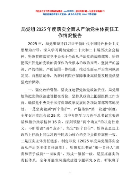 / 局党组2025年度落实全面从严治党主体责任工作情况报告