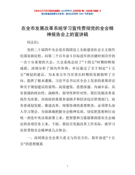 / 在全市发展改革系统学习宣传贯彻党的全会精神报告会上的宣讲稿