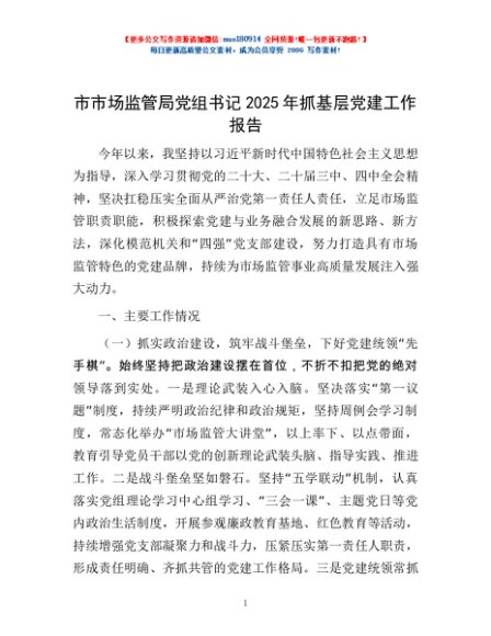 / 市市场监管局党组书记2025年抓基层党建工作报告