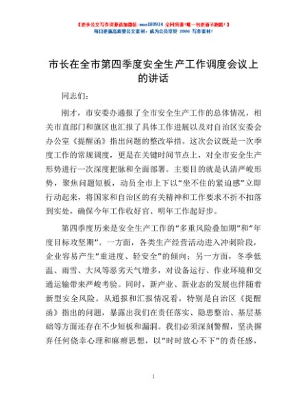 / 市长在全市第四季度安全生产工作调度会议上的讲话