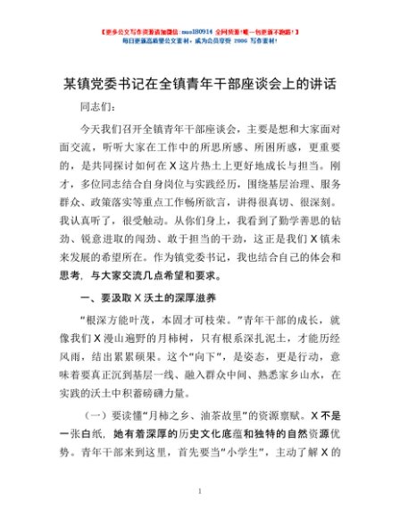 / 某镇党委书记在全镇青年干部座谈会上的讲话