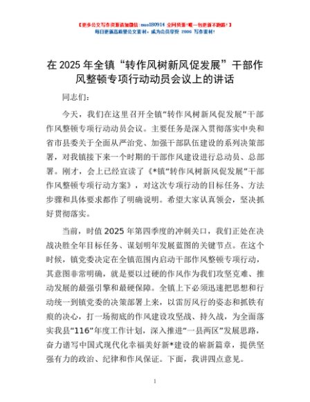 / 在2025年全镇“转作风树新风促发展”干部作风整顿专项行动动员会议上的讲话