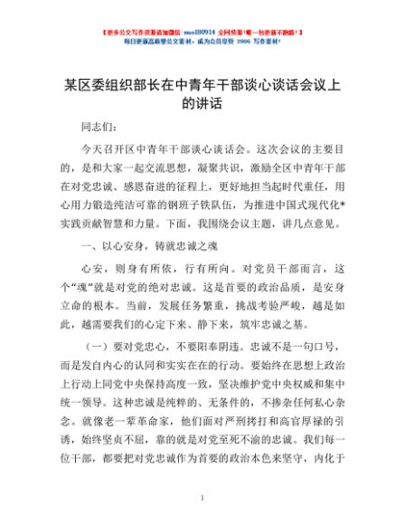 / 某区委组织部长在中青年干部谈心谈话会议上的讲话