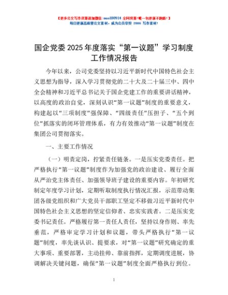 / 国企党委2025年度落实“第一议题”学习制度工作情况报告