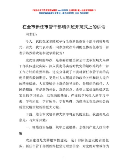 / 在全市新任市管干部培训班开班式上的讲话