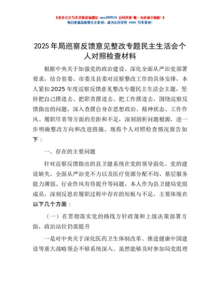 / 2025年局巡察反馈意见整改专题民主生活会个人对照检查材料
