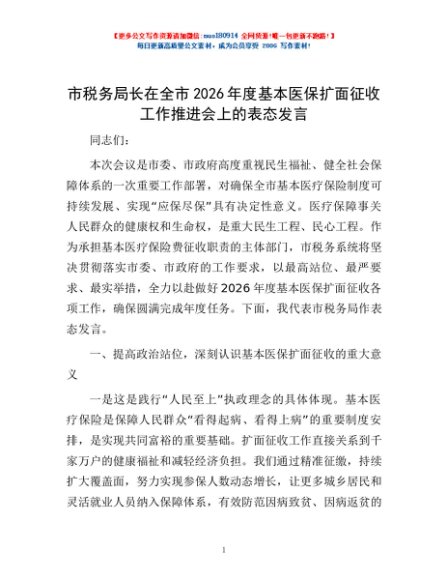 / 市税务局长在全市2026年度基本医保扩面征收工作推进会上的表态发言