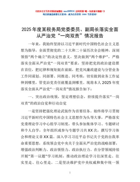 / 2025年度某税务局党委委员、副局长落实全面从严治党“一岗双责”情况报告