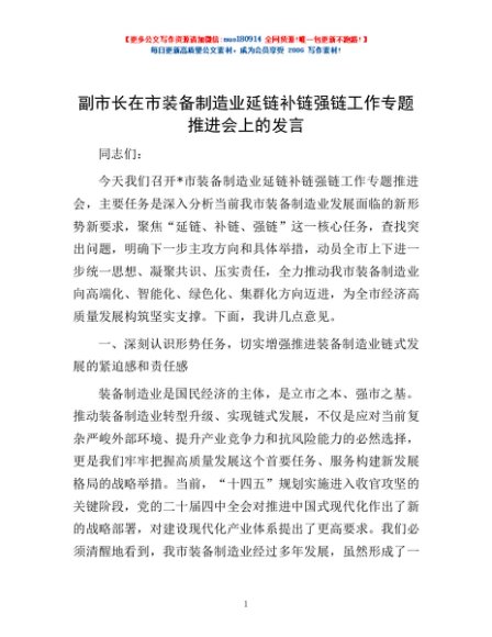 / 副市长在市装备制造业延链补链强链工作专题推进会上的发言