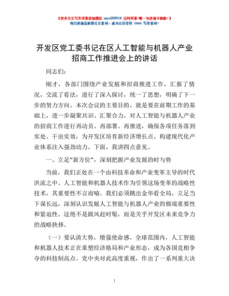 / 开发区党工委书记在区人工智能与机器人产业招商工作推进会上的讲话