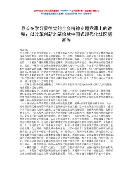 / 县长在学习贯彻党的全会精神专题党课上的讲稿:以改革创新之笔绘就中国式现代化城区新画卷