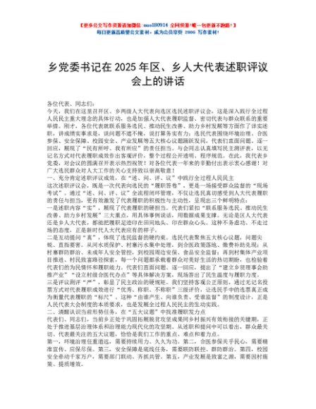 / 乡党委书记在2025年区、乡人大代表述职评议会上的讲话