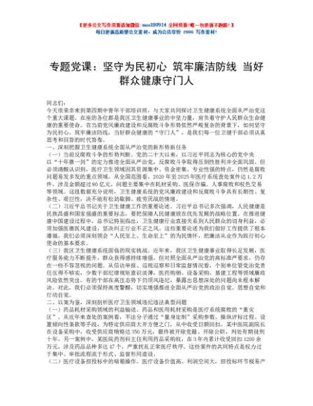 专题党课:坚守为民初心 筑牢廉洁防线 当好群众健康守门人