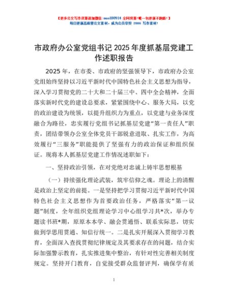 / 市政府办公室党组书记2025年度抓基层党建工作述职报告