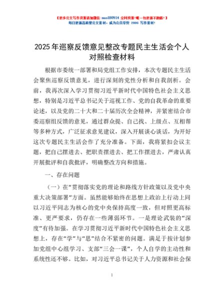/ 2025年巡察反馈意见整改专题民主生活会个人对照检查材料