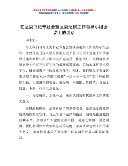 / 在区委书记专题会暨区委巡察工作领导小组会议上的讲话