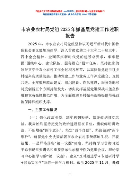 / 市农业农村局党组2025年抓基层党建工作述职报告