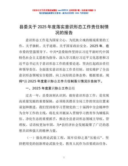 / 县委关于2025年度落实意识形态工作责任制情况的报告