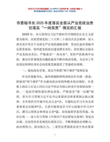 / 市委秘书长2025年度落实全面从严治党政治责任落实“一岗双责”情况的汇报