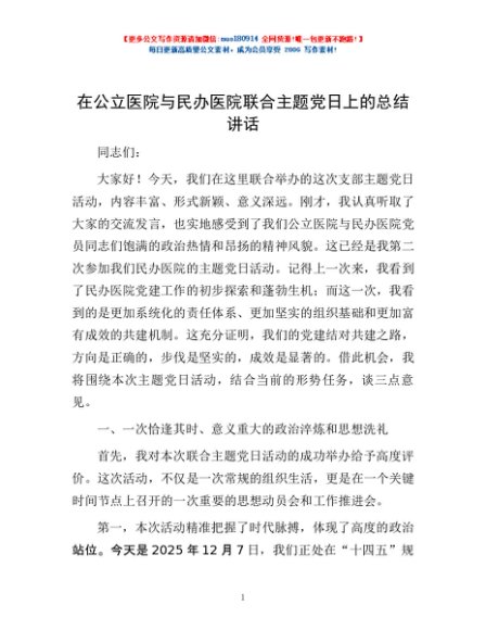 / 在公立医院与民办医院联合主题党日上的总结讲话