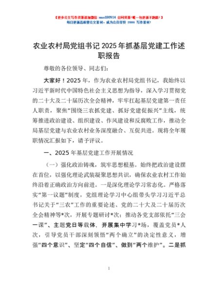 / 农业农村局党组书记2025年抓基层党建工作述职报告