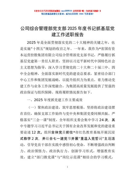 / 公司综合管理部党支部2025年度书记抓基层党建工作述职报告