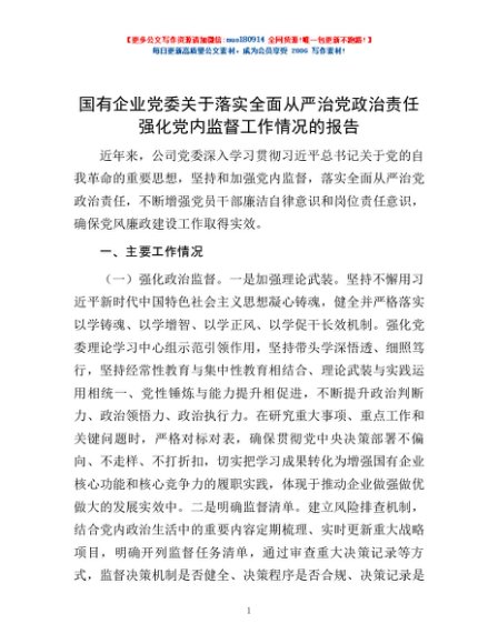 / 国有企业党委关于落实全面从严治党政治责任强化党内监督工作情况的报告