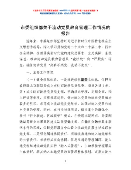 / 市委组织部关于流动党员教育管理工作情况的报告