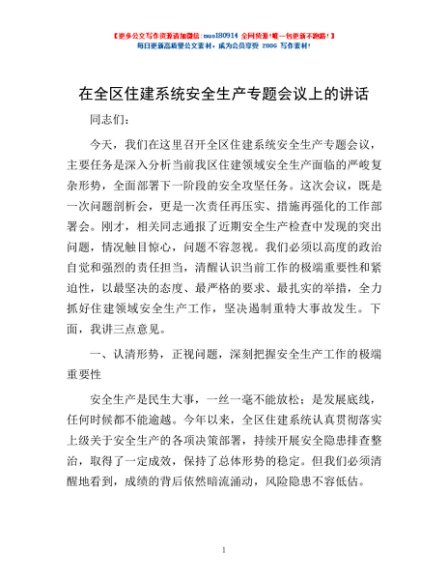 / 在全区住建系统安全生产专题会议上的讲话
