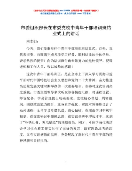 / 市委组织部长在市委党校中青年干部培训班结业式上的讲话