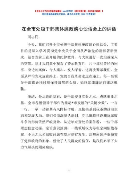 / 在全市处级干部集体廉政谈心谈话会上的讲话
