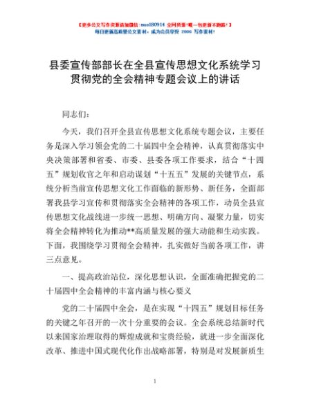 / 县委宣传部部长在全县宣传思想文化系统学习贯彻党的全会精神专题会议上的讲话