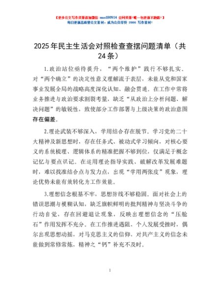 / 2025年民主生活会对照检查查摆问题清单(共24条)