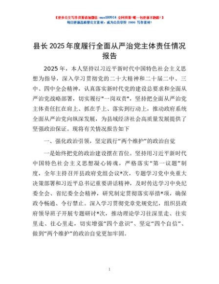 / 县长2025年度履行全面从严治党主体责任情况报告