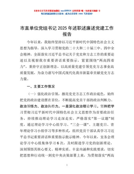 / 市直单位党组书记2025年述职述廉述党建工作报告