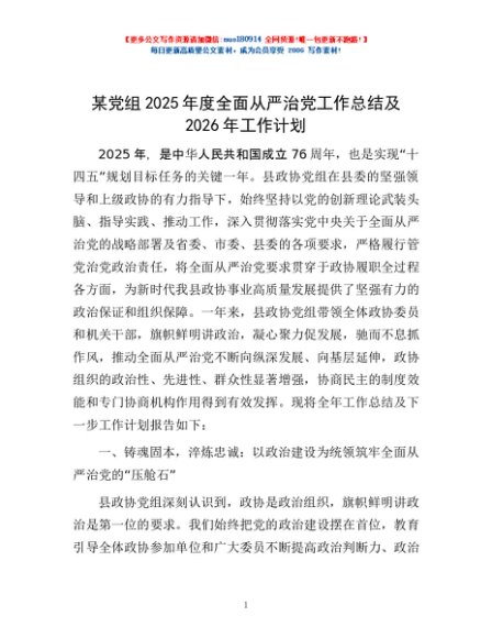 / 某党组2025年度全面从严治党工作总结及2026年工作计划