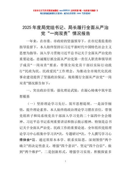 / 2025年度局党组书记、局长履行全面从严治党“一岗双责”情况报告