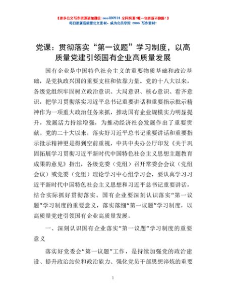 / 党课:贯彻落实“第一议题”学习制度,以高质量党建引领国有企业高质量发展