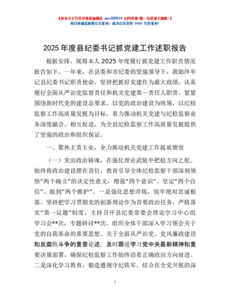 / 2025年度县纪委书记抓党建工作述职报告