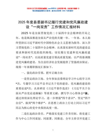 / 2025年度县委副书记履行党建和党风廉政建设“一岗双责”工作情况汇报材料