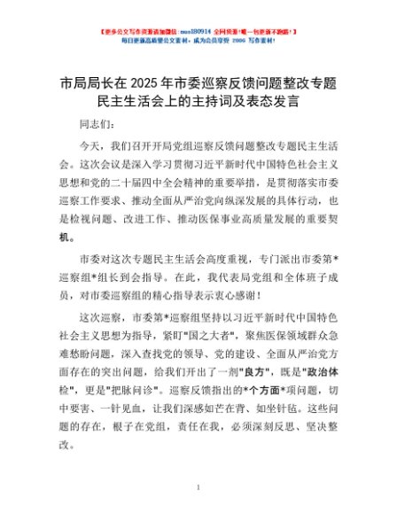 / 市局局长在2025年市委巡察反馈问题整改专题民主生活会上的主持词及表态发言