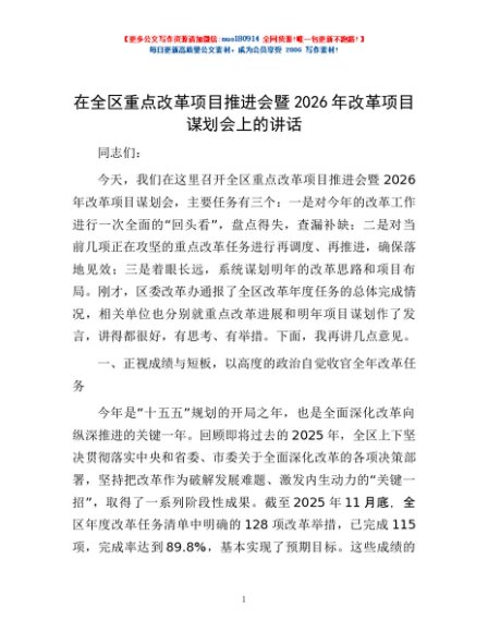 / 在全区重点改革项目推进会暨2026年改革项目谋划会上的讲话