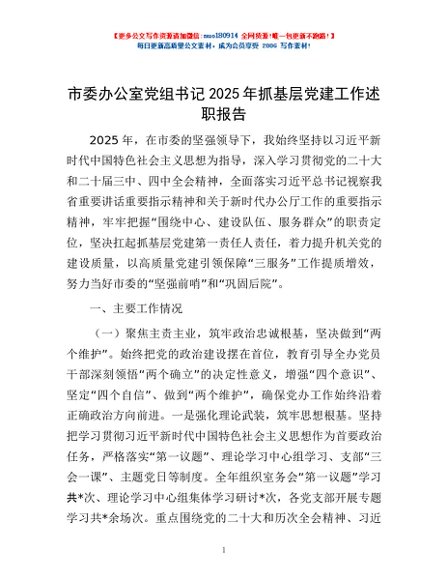 / 市委办公室党组书记2025年抓基层党建工作述职报告