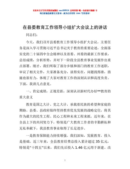 / 在县委教育工作领导小组扩大会议上的讲话