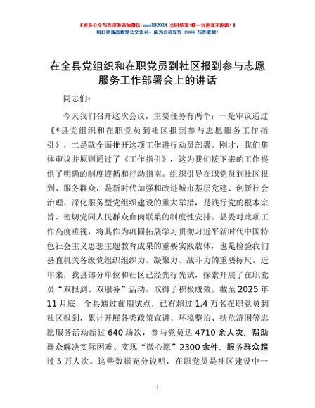 / 在全县党组织和在职党员到社区报到参与志愿服务工作部署会上的讲话